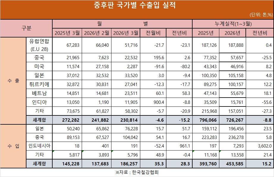 [표] 1분기 열연강판 수입 40% 이상 감소