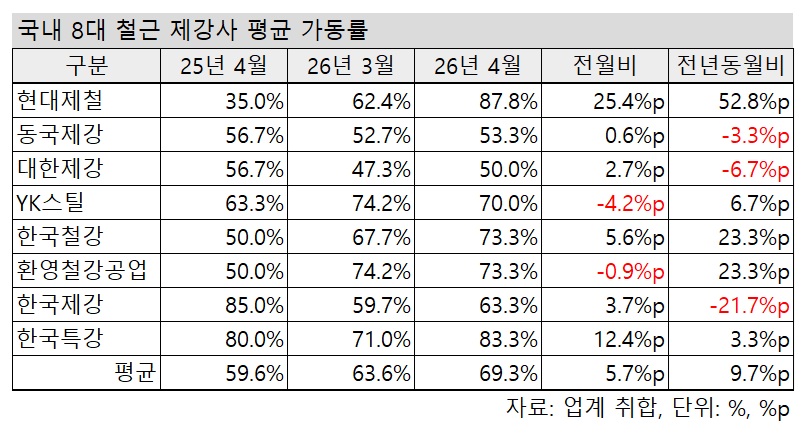반면 최대 메이커 현대제철의 이달 가동률은 87.8%로 전년 동월 대비 52.8%p, 전월 대비 25.4%p 각각 급등할 전망이다.