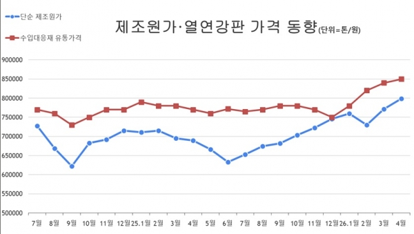 본지가 집계한 자료에 따르면 4월 기준 열연강판 제조원가는 79만9천 원 수준(단순 추정)까지 올라섰다. 지난 2월 72만 원대 후반 수준을 저점으로 3월과 4월 연속 상승하며 80만 원 선에 근접한 흐름이다. 최근 들어 원가 상승 속도가 다시 빨라지고 있다는 평가가 나온다.