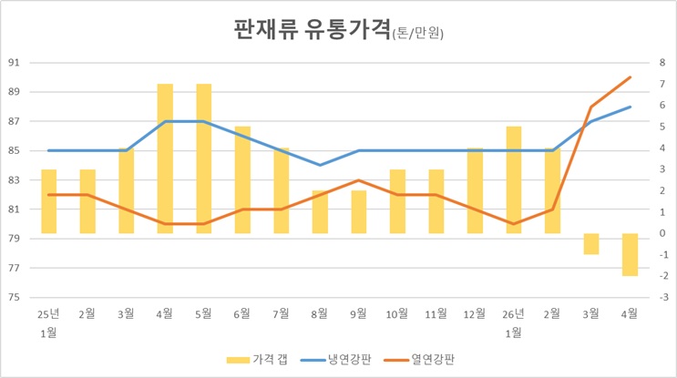 특히 냉연판재류 유통가격이 지지부진한 흐름을 보인 탓에 가전과 건자재 등 주요 수요처와의 협상에서 가격 인상 반영이 쉽지 않은 점도 영향을 미치고 있다는 분석이다. 여기에 중동 정세 불안에 따른 에너지와 물류 비용 상승까지 더해지며 제조원가 부담은 더욱 커지고 있다.
