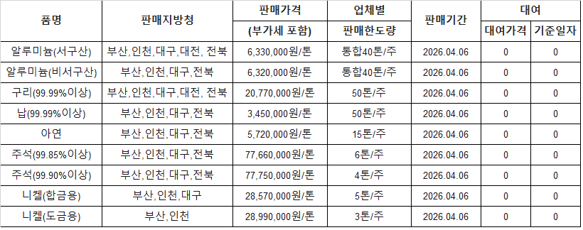 [표] 조달청 방출 가격(4월 6일)