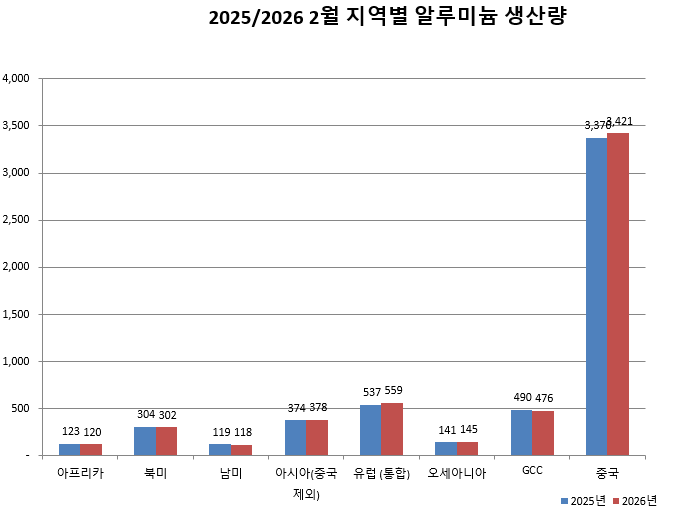 세계 최대 알루미늄 생산국인 중국의 2월 알루미늄 생산량은 342만1천톤으로 지난해보다 1.51% 늘어나며 생산 증가를 견인했다.