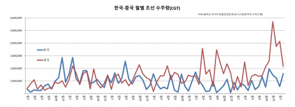 국가별로 보면 중국은 215만CGT(84척)를 수주해 점유율 53%를 기록했다. 2월 80%에 달했던 비중보다는 낮아졌지만 여전히 과반 이상을 확보하며 시장 주도권을 이어갔다.