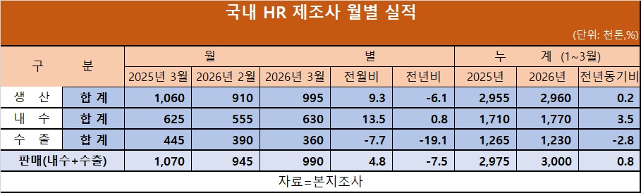 국내 열연강판 시장에서 3월 판매가 늘며 물량이 확대됐다. 내수 판매 증가가 전체 판매를 이끈 가운데 1분기 기준에서도 국산 중심 수급 흐름이 이어지는 모습이다.