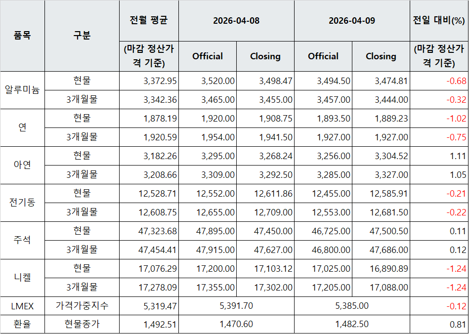 [표] LME 비철금속 및 환율 동향(4월 9일)