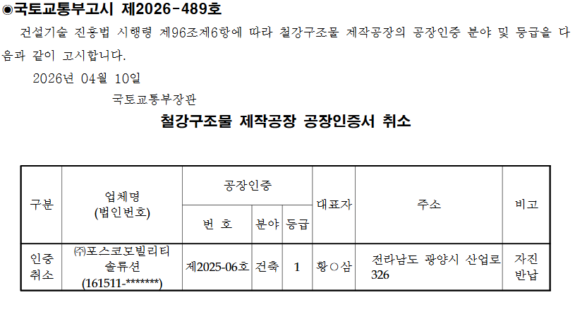 국토교통부는 10일, 정부고시를 통해 포스코모빌리티솔루션 전남 광양1공장의 철강구조물 제작공장 1등급 인증을 취소한다고 밝혔다. 포스코모빌리티솔루션은 지난 4월에 1등급 인증을 취득한 바 있다. 건축분야 1급 철강구조물 제작공장은 모든 종류의 철골 구조물을 제작할 수 있는 최고 등급의 공장을 뜻한다.