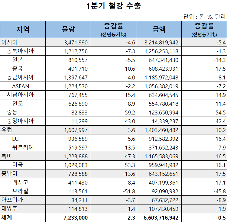 수출은 주요 지역별 증감 방향이 엇갈렸다. 북미로의 수출이 122만 톤으로, 지난해 1분기 대비 47.3% 증가하며, 최근 11개년 내 최대치를 기록했다. 미국으로의 수출(103만 톤)이 철근 수출에 힘입어 53.3% 증가, 2015년 1분기(122만 톤) 이후 처음으로 100만 톤을 웃돌았다.