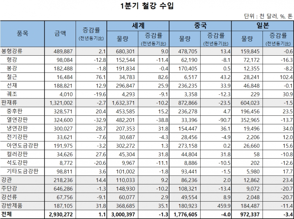 한편, 1분기 한국의 철강 수입은 300만 톤으로 지난해 같은 분기 대비 1.3% 감소하며, 3년 연속 줄었고, 2010년 1분기(649만 톤) 이후 가장 적었다. 수입액은 29억3천만 달러로 소폭(1.1%) 늘었다.