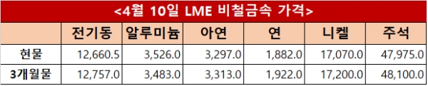 런던금속거래소(LME) 10일(현지시간) 기준 전기동 현물과 3개월물은 각각 톤당 12,660.5달러와 12,757달러를 기록했으며 알루미늄은 3,526달러와 3,483달러, 아연은 3,297달러와 3,313달러로 집계됐다. 연은 1,882달러와 1,922달러, 니켈은 17,070달러와 17,200달러, 주석은 47,975달러와 48,100달러를 나타냈다.