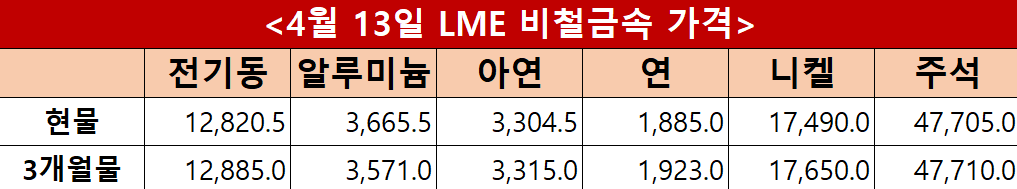 런던금속거래소(LME) 14일(현지시간) 기준 전기동 현물과 3개월물은 각각 톤당 12,820.5달러와 12,885달러를 기록했으며, 알루미늄은 3,665.5달러와 3,571달러, 아연은 3,304.5달러와 3,315달러로 집계됐다. 연은 1,885달러와 1,923달러, 니켈은 17,490달러와 17,650달러, 주석은 47,705달러와 47,710달러를 나타냈다.
