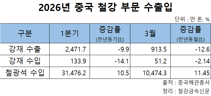 철강 수입도 감소세를 이어갔다. 중국의 1분기 강재 수입은 133만9천 톤으로 지난해 같은 분기 대비 14.1% 줄었고, 3월 수입은 51만2천 톤으로 전년동월대비 2.14% 감소했다. 같은 기간 한국의 대(對) 중국 강재 수출도 각각 15.1%, 12.6% 줄어, 35만9천, 11만6천 톤을 기록했다.