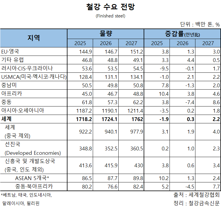 세계철강협회(WSA)는 14일(현지시각) 공개한 ‘2026년 4월 세계 철강 단기 전망’ 보고서에서 올해 세계 철강(Finished steel) 수요를 17억2,410만 톤으로 예측, 지난해보다 0.3% 증가할 것으로 내다봤다. 2027년(17억6,200만 톤)은 회복세가 더욱 뚜렷해 올해보다 2.2% 증가할 것으로 예측했다.