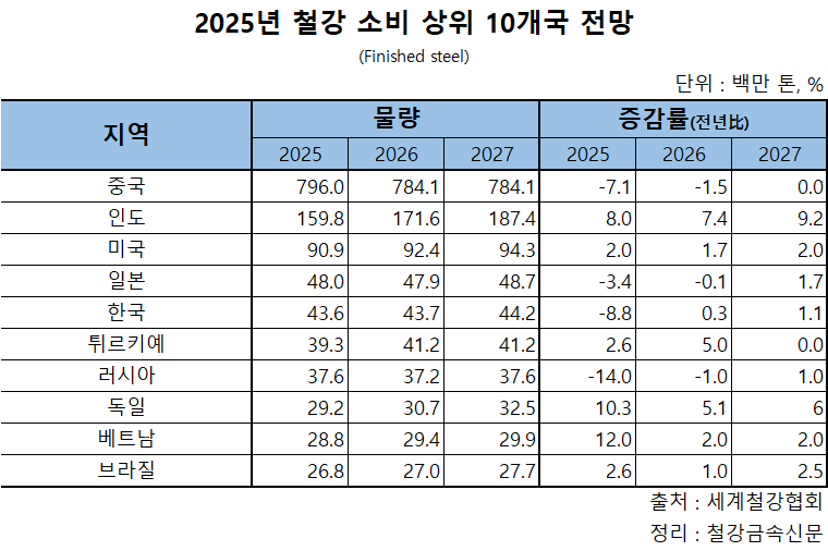 인도의 수요는 주요 철강 수요 산업 전반의 고른 강세에 힘입어 올해와 내년 각각 7.4%, 9.2% 증가할 것으로 전망됐다.