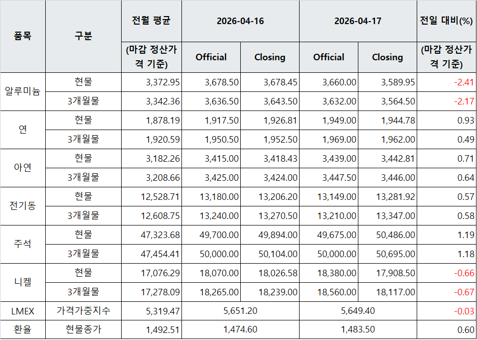 [표] LME 비철금속 및 환율 동향(4월 17일)