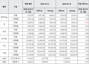 [표] LME 비철금속 및 환율 동향(4월 22일)