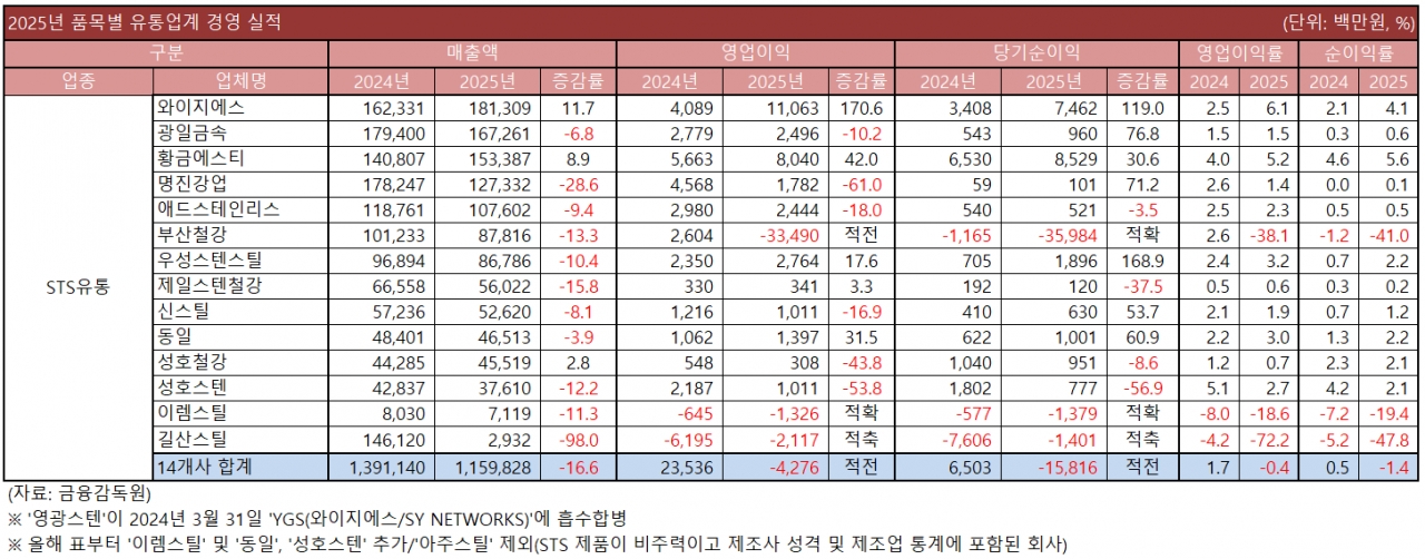 또한 STS 유통업계의 수익성도 크게 악화됐다. 14개 사의 영업이익 합은 42억 원 적자로 2024년 235억 원 흑자에서 적자로 전환했다. 14개 사의 당기순이익 합도 158억 원 적자를 기록하며 2024년 65억 원 흑자에서 적자로 전환했다.