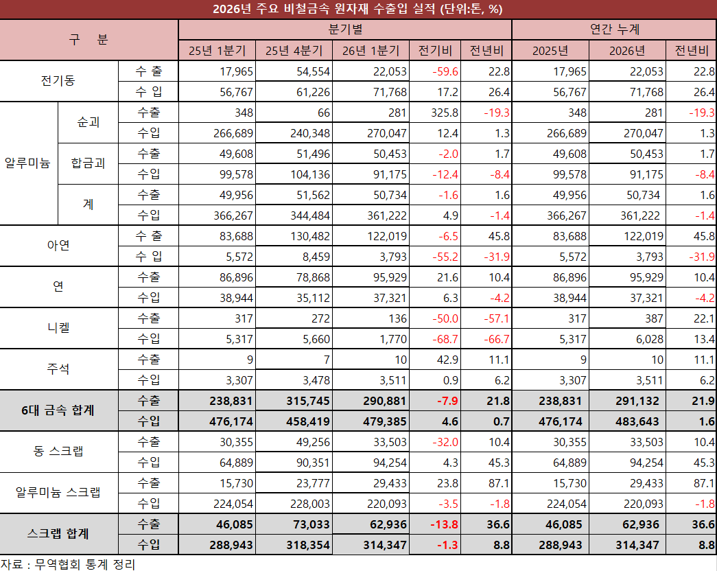 한국무역협회 통계에 따르면 지난 1분기 비철금속 원자재(전기동/알루미늄/아연/연/니켈/주석) 수출은 전년 동기 대비 21.8%, 수입은 0.7% 늘어났다.